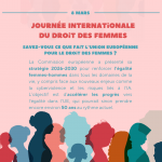 8 Mars – Journée internationale du Droit des Femmes, et en Europe ? 10/03/2026A l'occasion du 8 mars, la Commission européenne dévoile sa stratégie 2026-2030 pour accélérer l’égalité entre les femmes et les hommes dans toute l’UE. Cliquez pour en savoir plus !
