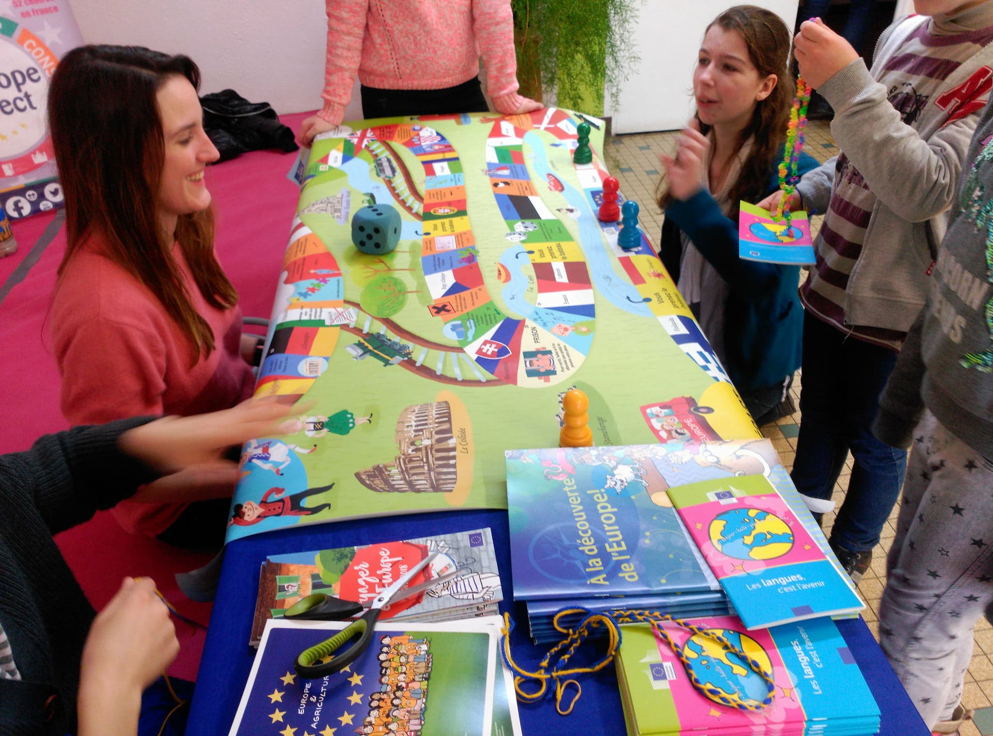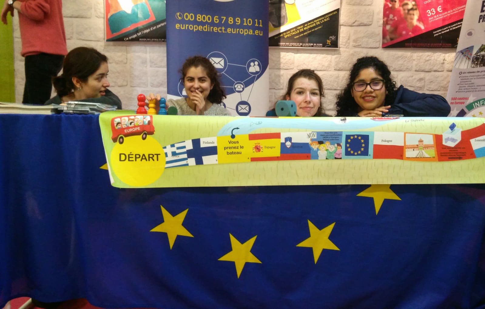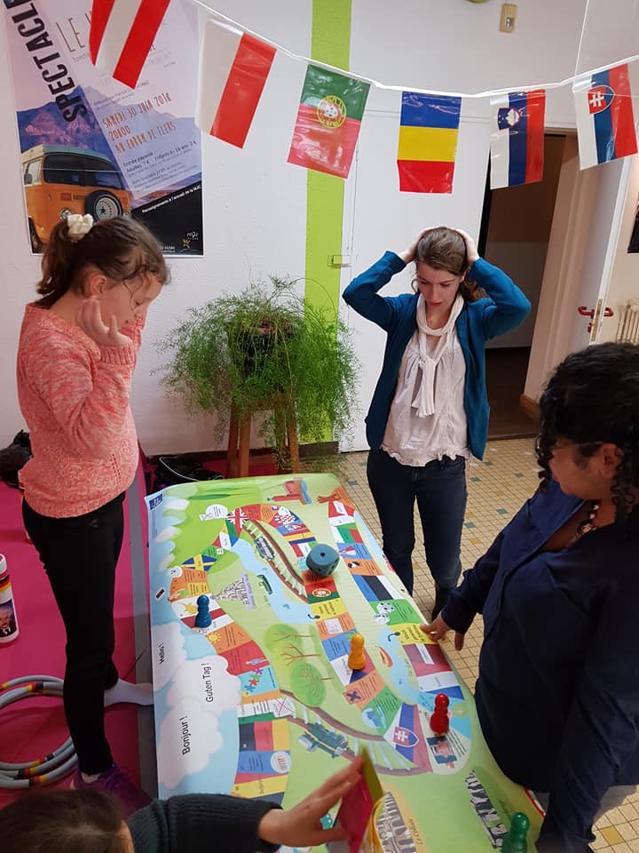 Avec l’équipe de la MJC de Flers, Emilie, Dennis, Belen et Aleksandra, nous avons proposé des jeux aux visiteurs de la MJC. Petits et grands ont pu en apprendre plus sur les pays européens.